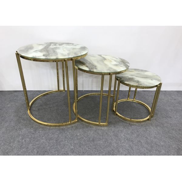 Three piece tea table, tempered glass paste Stone paper, fashionable and beautiful; high quality stainless steel gold-plated frame, stable and reliable, strong bearing capacity.